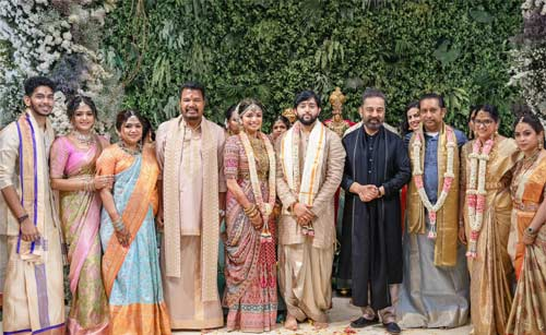 Though specific details regarding the wedding venue and timing remain undisclosed, the couple’s traditional ceremony has captured attention, with intimate wedding snapshots circulating across social media platforms. Notable figures, including CM Stalin, Kamal Haasan, Chiyaan Vikram, Atlee, Suriya, Karthi, Vignesh Shivan, Nayanthara, Maniratnam, Suhasini, and others, graced the occasion, adding to the festive atmosphere.